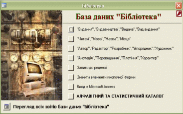 Використовуючи режим Конструктора для створення форм даної БД бібліотечного фонду “Тальнівського будівельно-економічного коледжу УДАУ” було оформлено 21 форму. Серед них головна форма (Рис.3.7) з якої можна перейти на інші форми - це форми по створеним таблицям БД “Розробники", “Мови”, “Місце”, “Читачі", “Автори", “Упорядники”, “Редактори", “Художники", “Перекладачі", “Розміщення”, “Видача", “Перевидання", “Плетіння", “Видання”, “Характери", “Назви", “Вид видання", “Видавництва", “Анотації" (Додаток Г, Д).