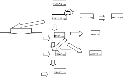 Єдиним зв’язком (неявним) між модулями Hord.cpp та Show.cpp є спільне використання файлів KORENI.TXT та MEGI.TXT.
