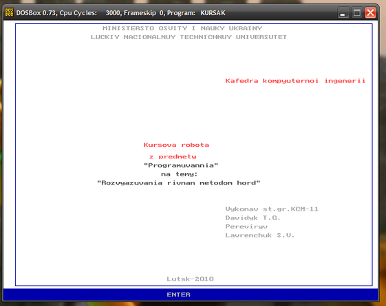 Після запуску програми спочатку бачимо зображення електронної титульної сторінки. Програма чекає, поки буде натиснута довільна кнопка. Що ми і робимо. З’являється графік функцій. Знову натискаємо довільну кнопку. З’являється вікно із запитом на введення даних. Вводимо послідовно значення межі проміжка та похибки. Отримаємо результати: корінь рівняння та кількість ітерацій.