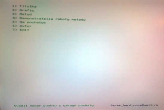 Натиснувши «7» – вийдемо з програми, обравши «6» побачимо вікно з інформацією про автора програми, «5» програма запускається заново, «4» запускається демонстрація роботи методу, «3» запускається введення даних, «2» запускається вікно з графіком, «1» запускається титульна сторінка.