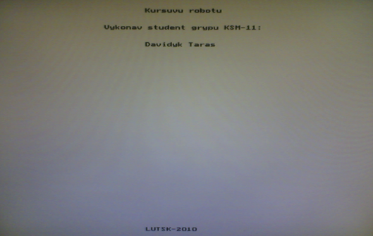 Запускаємо на виконання виконавчий файл нашого проекту. Спочатку бачимо зображення електронної титульної сторінки (рисунок 4.1).