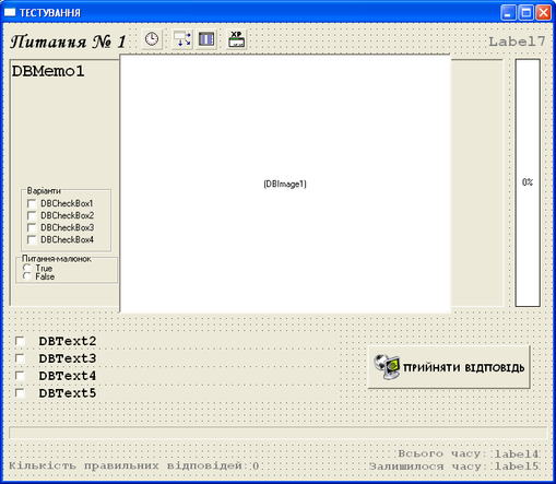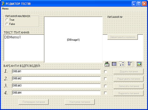 8. DBСhесkBох1, DBСhесkBох2, DBСhесkBохЗ, DBСhесkBох4 – компонента для роботи з базами даних. Для задання правильних відповідей.