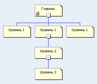 Сайт с трёхуровневой системой навигации (применяется для сложных сайтов с большим количеством информации):