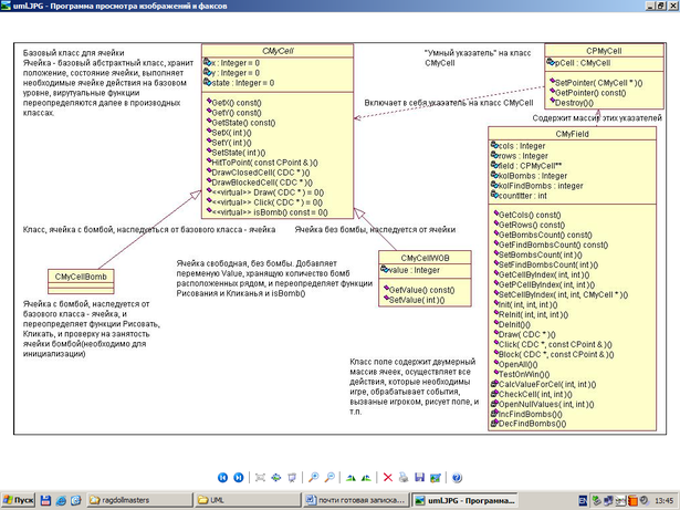 CmyCellBomb – класс, ячейка с бомбой, наследуется от базового класса – ячейки. Переопределяет функции Рисовать, Кликать, проверку на занятость ячейки бомбой.