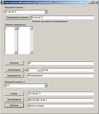 cout< int s1,s0;//кол-во единиц и кол-во нулей //размер массива равен размеру числа, умноженному на кол-во бит в байте, //т.е. 8, и 1 для закрывающего 0 char* str = new char[sizeof(n)*8+1]; //ставим закрывающий 0 str[sizeof(n)*8]='\0'; int s1max=0;//макс. кол-во единиц в простом числе int bmax[100]; //массив с простыми числами, сод-щими макс. число единиц int kmax=0; j=0;//счетчик //цикл по простым числам for (int k = 0; k < s; k++) { s1 = 0; s0 = 0; //ставим закрывающий 0 в начало, //чтоб потом можно было цеплять к концу 1 или 0 str[0]='\0'; //цикл по битам числа b[k] for (int i = sizeof(b[k])*8-1; i >= 0; i--) { //b[k]>>i - побитовый сдвиг вправо на i бит //0x1 - число 1 в бинарном представлении //((b[k]>>i) & 0x1) == 1 - позволяет определить бинарный вид числа if (((b[k]>>i) & 0x1) == 1) { s1++;//увелич. кол-во единиц strcat(str,"1");//цепляем "1" } else { s0++; //увелич. кол-во нулей strcat(str,"0");//цепляем "0" } } cout< //поиск макс. числа единиц if (s1>s1max) { s1max=s1; //массив bmax заполняется числами по возрастанию кол-ва единиц //в их двоичной записи bmax[j]=b[k]; j++; kmax=0;//кол-во чисел с макс. на текущий момент числом единиц } if (s1==s1max) { kmax++;//увелич., т.к. s1 равно s1max //массив bmax заполняется числами по возрастанию кол-ва единиц //в их двоичной записи bmax[j]=b[k]; j++; } } int jmax=j-1;//кол-во элементов в массиве bmax //печать простых чисел, в двоичной записи которых //содержится максимальное число единиц cout< cout<<"Result: "< for (i=jmax; i>jmax-kmax; i--) cout< cout< delete str; delete a; delete b; system("PAUSE"); return 0; } Интерфейс программы приведен на рис. 5. Рис. 5. Интерфейс программы нахождения простых чисел, не превосходящих заданного N, с максимальным количеством единиц в бинарном представлении. Заключение За время выполнения курсовой работы я ознакомилась с основами синтаксического анализа (на примере анализа полинома), с основами программирования на языке C#, приобрела опыт разработки визуальных приложений в среде MS Visual Studio 2005. Разработанная мною программа осуществляет синтаксический анализ полиномов, и, в частности, преобразует заданный полином к приведенному виду, вычисляет его значение, определяет, является ли полином однородным, находит его производную по заданной переменной, строит сумму и произведение двух заданных приведенных полиномов, определяет делимость одного полинома на другой без остатка. Кроме этого мною было выполнено дополнительное задание по определению простых чисел, не превосходящих заданного N, в двоичной записи которых содержится максимальное число единиц. Эта программа была реализована в среде MS Visual Studio 2005 на языке C++ в виде консольного приложения. Список литературы Ахо, А. В. Компиляторы: принципы, технологии и инструментарий, 2‑е изд./ А. В. Ахо, М. С. Лам, Р. Сети, Д. Д. Ульман. – М.: Издательский дом "Вильямс", 2008. Хантер, Р. Основные концепции компиляторов / Р. Хантер. – М.: Издательский дом "Вильямс" , 2002. – 256 с. Баженова, И.Ю. Введение в программирование: Учебное пособие / И.Ю. Баженова, В.А. Сухомлин. – М.: Интернет-университет информационных технологий; БИНОМ. Лаборатория знаний, 2007. – 326 с. Харт, Д.М. Системное программирование в среде Windows, 3-е издание: Пер. с англ./ Д.М. Харт. – М.: Издательский дом "Вильямс", 2005. – 592 с. Бронштейн, И.Н. Справочник по математике / И.Н. Бронштейн, К.А. Семендяев. – М.: Наука, 1980. – 976 с. Черемушкин, А.В. Лекции по арифметическим алгоритмам в криптографии. – М.: МЦНМО, 2002. – 104 с