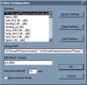 а) Все компоненты необходимые при создания схемы распологаються в библиотеках которые должны быть подключены в проэкте. Для выполнения этого действия необходимо выбрать команду Options/Editor Configuration , в подменю Liblrary Setting добавить необходимые библоетеки для проэкта (рис. 1).