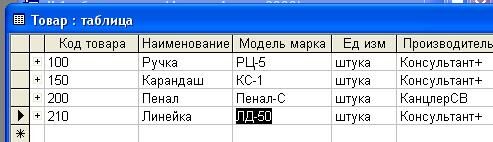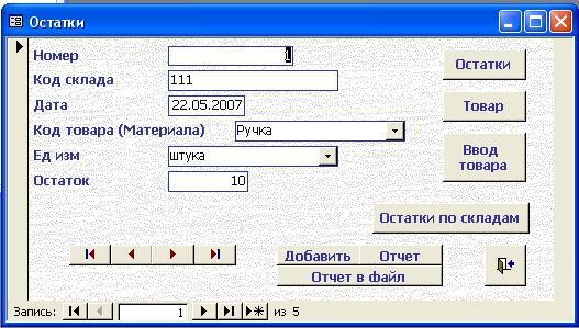 Кнопки «Остатки, товар» открывают наши таблицы. Кнопка «Ввод товара» открывает вторую форму для просмотра и редактирования записей в таблице товар.