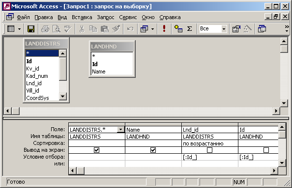 Запрос – объект, содержащий текст SQL запроса, имеющий уникальное имя в определенной базе данных. Создать запрос можно с помощью мастера и в режиме конструктора. В первом случае пользователю в интерактивном режиме предлагается выбрать имя таблицы и поля для выборки. Во втором случае можно выбрать несколько таблиц или запросов, связать их графическим способом и определить поля выборки5. Также можно задать дополнительные условия для каждого поля и параметры сортировки.