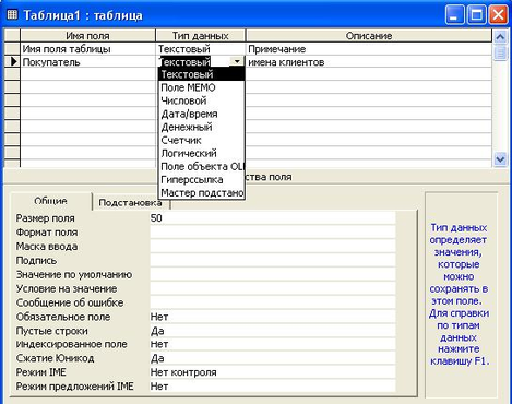 «Тип данных» поля, по желанию «Примечание» и при достаточной подготовке можно использовать расширенные настройки полей, такие как: Символьный размер поля, кодировка, формат и многое прочее, представлены в нижней части окна конструктора.