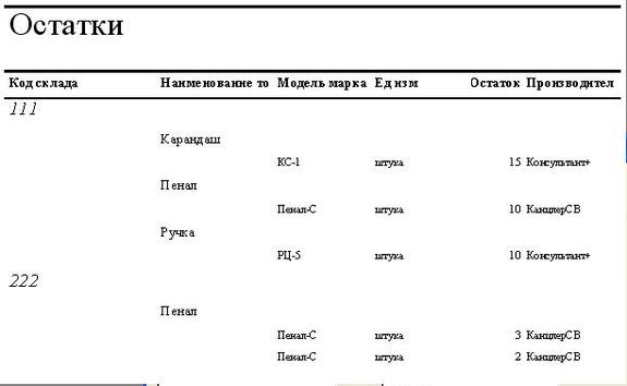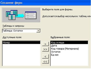 Кнопка «Остатки по складам» открывает сводную таблицу (запрос) которая содержит данные из обеих таблиц и вычисляемое поле «Остатки по складам».