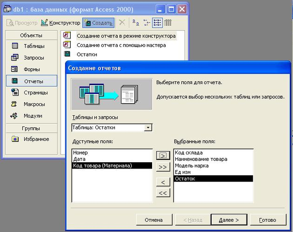 Для создания «отчета» производим те же действия, только создаем с помощью мастера. Выбираем нужные поля из разных таблиц для формирования необходимой структуры, показа требуемых данных.