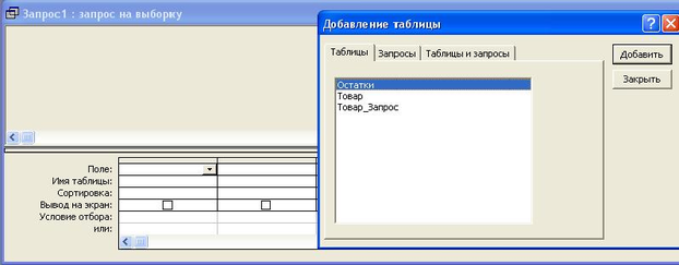 Так же как и в предыдущих случаях выбираем вкладку «Запрос», жмем кнопу «Создать» и выбираем «конструктор». В появившихся окнах выбираем таблицы и далее необходимые поля для показа из этих таблиц.