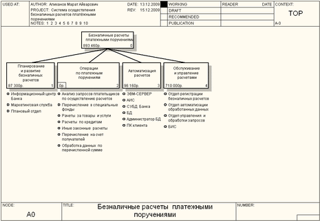 Диаграмма дерева узлов показывает иерархию работ в модели и позволяет рассмотреть всю модель целиком, но не показывает взаимосвязи между работами (стрелки). Процесс создания модели работ является итерационным, следовательно, работы могут менять свое расположение в дереве узлов многократно. Чтобы не запутаться и проверить способ декомпозиции, следует после каждого изменения создавать диаграмму дерева узлов.