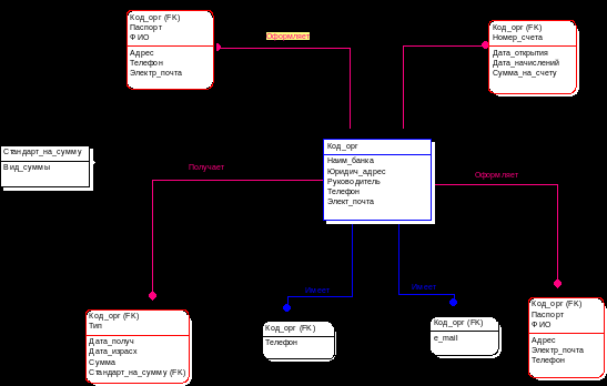| Оформляет | Identifying | A Банк Оформляет zero, one or more Счетаs. |