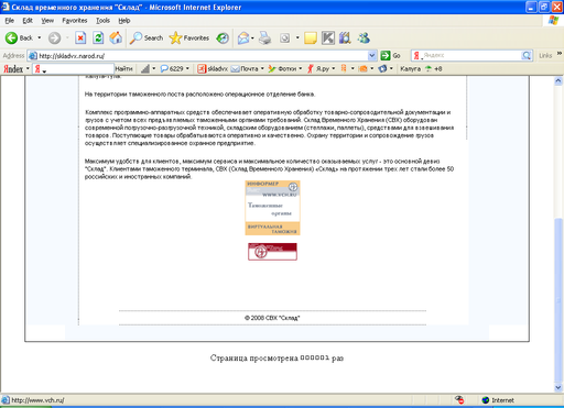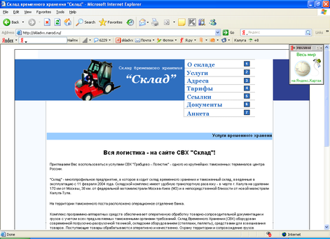 Исходя из всего вышесказанного мы видим, что для продвижения информации о услугах склада временного хранения имеется возможность использовать всемирную компьютерную сеть Интернет. В ходе выполнения работы был проведен комплекс мер по планированию, проектированию, разработке и внедрению сайта склада временного хранения (СВХ). Результатом работы стал размещенный в сети сайт, доступный любому пользователю сети Интернет по адресу http://skladvx.narod.ru/.