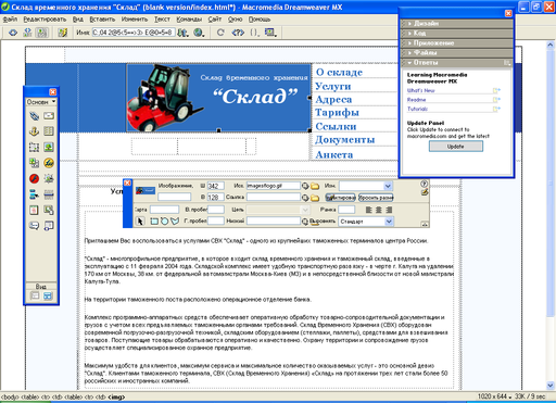 На рис 5. Приведен внешний вид страницы в процессе разработки в программе Macromedia Dreamweaver MX.