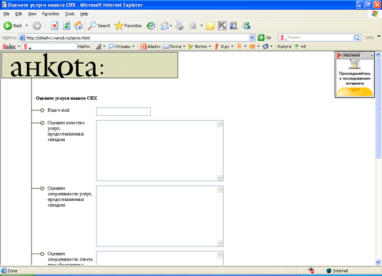 Так же на сайте предусмотрено анкетирование пользователей по вопросу качества предоставляемых компанией услуг. Это позволит повысить эффективность работы СВХ «Склад» и создаст условия для комфортной работы партнеров – участников ВЭД (рис 8.)