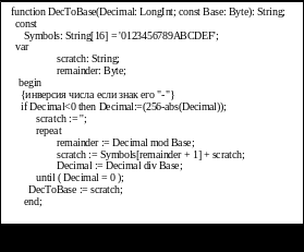 Данная функция является программным осуществлеием алгоритма преобразования числа из десятичной системы счисления в любую другую, описанного выше.