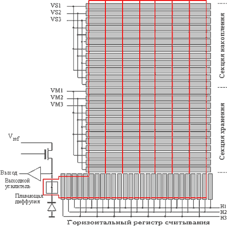 По окончании прямого хода по кадру на обе секции подаются тактовые импульсы, вызывающие синхронный перенос заряда, при этом важно (и это показано на рисунке), что обе секции образуют непрерывный регистр сдвига. После числа тактов, равного числу строк в каждой секции (напомним, что каждая строка образована тремя электродами), весь накопленный зарядовый рельеф целиком переместится в секцию памяти, закрытую от света, а секция накопления будет очищена от заряда. Этот перенос секции в секцию происходит достаточно быстро (фактически он занимает малую часть времени обратного хода по кадру). Теперь, во время следующего цикла накопления (это следующее поле кадровой развёртки), секция накопления накапливает следующий кадр изображения, а из секции памяти заряды построчно, во время обратного хода по строке, передаются в горизонтальный регистр), каждый элемент регистра имеет зарядовую связь с соответствующим столбцом секции памяти, и за один раз передаётся одна строка, и затем выводятся в выходное устройство регистра за время прямого хода по строке, формируя видеосигнал. О выходном устройстве мы подробнее поговорим ниже.
