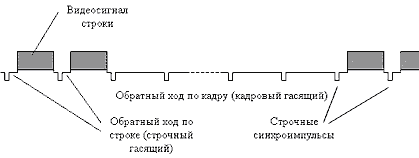 содержит видеосигналы отдельных строк, разделённые интервалом обратного хода по строке (строчный гасящий интервал), необходимым для того, чтобы электронный луч, как в кинескопе, так и в передающей камере (вспомним, что этот стандарт возник достаточно давно, в эпоху вакуумных приборов) успел вернуться к началу следующей сроки. Во время этого интервала подается и строчный синхроимпульс, формируется не самим датчиком изображения, а замешивается в сигнал электронными схемами камеры). Уровень синхроимпульсов принят за 0, уровень черного в видеосигнале составляет 0,33 В, уровень гасящего - 0,3 В (30 мВ разницы образуют т. н. защитный интервал), максимальный уровень видеосигнала (уровень белого) - 1,00 В. Когда переданы сигналы всех строк одного поля, начинается формирование кадрового гасящего интервала. Строчные синхроимпульсы в это время продолжают формироваться, чтобы не сбивать схемы строчной развёртки кинескопа (в реальности их частота на короткое время, равное 2,5 длительности строки, удваивается, а полярность инвертируется, чтобы обозначить кадровый синхроимпульс), а видеосигнал не формируется. Затем, по окончании кадрового гасящего, начинается прямой ход по кадру для следующего поля. По принятому, например, в Европе стандарту период строчной развёртки составляет 64 мкс, длительность прямого хода по строке - 52 мкс, длительность обратного хода по строке - 12 мкс, а длительность кадрового гасящего - 25 строк. При этом в каждом поле имеется 312,5 строки, из которых 287,5 - активные, т. е. имеющие видеосигнал (полстроки возникает из-за того, что полное число строк в кадре для чересстрочной развёртки нечётное - 625).