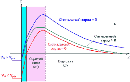 Рис.4б. Распределение потенциалов в ПЗС со скрытым каналов при отсутствии сигнального заряда, с сигнальным зарядом и при фиксации поверхностного потенциала.
