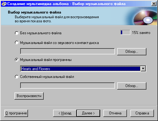 Следующим этапом, к создаваемому диску прикрепляется музыкальный файл, который будет воспроизводиться во время показа фотографий.