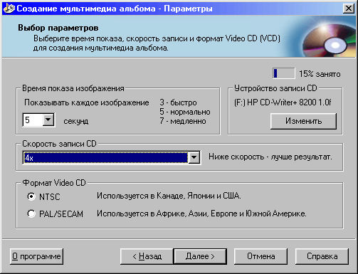 Параметры записи компакт-диска устанавливаются на завершающем этапе подготовки Video CD.