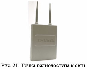 стоимость своих электрических «собратьев», при более низкой скорости передачи данных. Для подключения компьютеров используются сетевые адаптеры с PCI интерфейсом (на рис. 20 слева) и с USB интерфейсом (на рис. 20 справа). Беспроводной доступ может быть организован и с помощью обычных сетевых адаптеров, но в этом случае сетевой адаптер должен быть подключен к радиоприёмнику/передатчику (точке беспроводного доступа). Один из вариантов исполнения точки беспроводного доступа приведен на рисунке 21. Подключение сетевой платы к радиоточке выполняется с помощью стандартного соединительного шнура (рис. 19 слева). Кроме того, точка доступа исполняет роль центра беспроводной сети при объединении более двух компьютеров в беспроводную сеть. В таком случае она подключается к компьютеру, играющему в данной сети главенствующую роль – серверу. Либо при подключении точки доступа через маршрутизатор к проводной сети, вы получаете возможность обмениваться информацией со стационарными компьютерами.