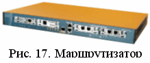 Маршрутизатор (router) – устройство (рис. 17) с несколькими физическими интерфейсами, которые могут принадлежать к одной или разным сетевым технологиям. Используется для разделения или объединения нескольких компьютерных сетей (например, сеть 100VG-AnyLAN с сетью Ethernet). Задача маршрутизатора отфильтровывать пакеты и пропускать с одного интерфейсного входа на другой только те пакеты, которые адресованы компьютером, находящимся в одной сети, компьютеру, находящемуся в другой сети.