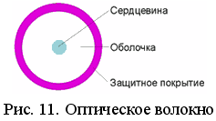 По своей конструкции (рис. 11) волоконно-оптический кабель похож на коаксиальный, только вместо центрального металлического проводника располагается стеклянное или пластиковое волокно по которому распространяется пучок света и вместо электрической изоляции такое волокно окружено оптической оболочкой, основная задача которой – не дать пучку света покинуть центральное волокно. Волоконно-оптический кабель не нуждается во внешней экранирующей оплётке, поскольку электромагнитные помехи не влияют на оптические сигналы, однако в некоторых конструкциях волоконно-оптических кабелей металлическая оплётка применяется с целью повышения механической прочности кабеля и защиты оптического волокна от механических повреждений. Такой волоконно-оптический кабель называется бронированным.