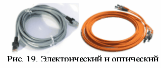 Для подключения различных устройств друг к другу и к соединительным розеткам и коммутационным панелям используются специальные шнуры, изготавливаемые в заводских условиях. Такие шнуры получили название patch cord. На рис. 19 слева шнур для электрических