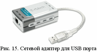 Третий вариант исполнения сетевого адаптера устанавливается на компьютер проще, но стоит несколько дороже внутреннего адаптера. Это сетевой адаптер подключаемый к USB порту (рис. 15). Подключение такого адаптера к персональному компьютеру возможно без отключения питания.