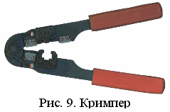 При монтаже кабельной сети с использованием витой пары применяется специальный инструмент, называемый кримпером (рис. 9). Кабель после снятия внешней изоляционной трубки укладывается в специальные направляющие для вилки RJ-45 либо непосредственно в вилку (в зависимости от её конструкции). Затем вилка вместе с кабелем вставляется в специальные направляющие кримпера (на рис. 9 на нижней рукоятке) и при нажатии на рукоятки инструмента гребёнка (рис. 9 на верхней рукоятке)