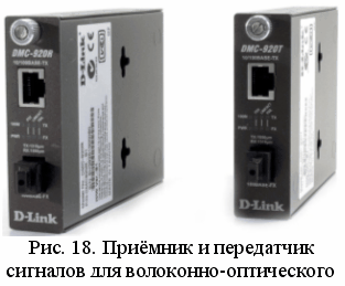 Для подключения сетевых адаптеров (обрабатывающих электрические сигналы) к волоконно-оптическому кабелю (передающему оптические сигналы) используются согласующие устройства. Приёмник (receiver, на рис. 18 слева) и передатчик (transmitter, на рис. 18 справа) могут исполняться в одном корпусе, а могут конструктивно быть разными устройствами.