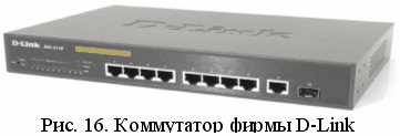 порта (розетки RJ-45) ко всем остальным. Повторитель «копирует» сигналы на все остальные порты и является самым дешёвым типом хабов. Коммутатор (рис. 16) может разбивать порты на группы, организуя логические сегменты сети. Компьютеры «общаются» друг с другом в пределах сегментов, тем самым уменьшается количество коллизий и повышается общее быстродействие сети. Частным случаем коммутатора является мост (bridge).