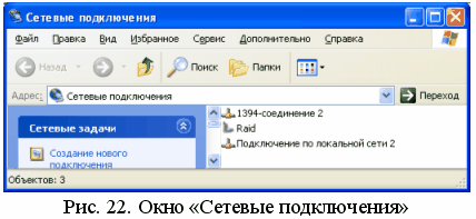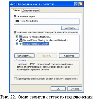 окне свойств подключения. Для того чтобы открыть окно свойств подключения по локальной сети необходимо в меню «Пуск» выбрать пункт «Подключение» и сделать щелчок левой кнопкой мыши на строке «Отобразить все подключения». В открывшемся окне (рис. 22) «Сетевые подключения» сделать щелчок правой кнопкой мыши на том подключении, которое нуждается в настройке и в появившемся контекстном меню выбрать строку «Свойства». В открывшемся окне свойств (рис. 23) указывается какое сетевое оборудование задействовано для данного подключения и какие программные средства ему необходимы для выполнения задач, решаемых пользователем. В указанном окне при нажатии кнопки «Настройка» предоставляются возможности по настройке сетевого адаптера, аналогичные рассмотренным в разделе 2.2 «Устройства ввода и вывода информации». В разделе описания компонентов перечислены установленные для данного