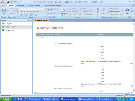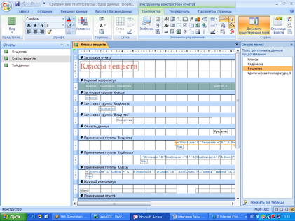 Отчет Классы веществ создан для наглядной демонстрации критических температур веществ, распределенных по классам. Для каждого вещества приведен расчет максимального значения из приведенного набора температур для оптимизации работы с данными. Отчет в режиме конструктора: