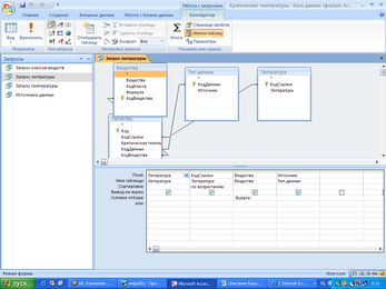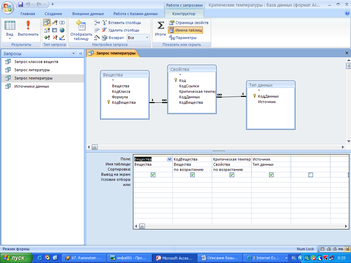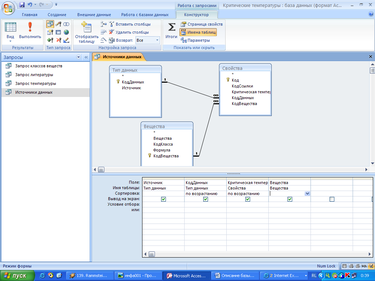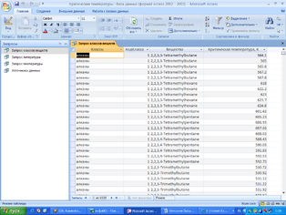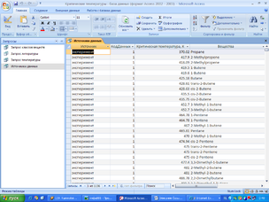 Запрос Источники данных позволяет также легко систематизировать данные по источникам данных по критическим температурам, значениями и индивидуальными веществами. При этом поля КодДанных и Критическая температура отсортированы по возрастанию.
