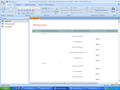 Таким образом, была создана база данных по критическим температурам ряда органических веществ различных классов. Естественно, представленная база не отображает всех имеющихся в мировой литературе данных по экспериментальным и расчетным критическим температурам, однако может быть дополнена и расширена с учетом новых данных. Представленные отчеты, формы и запросы призваны упростить исследователю работу с базой, позволяя по различным начальным параметрам определять необходимые данные.