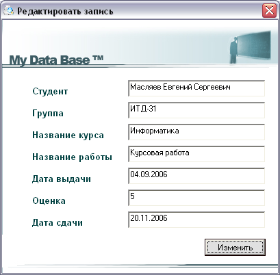 Public Const strDescription = "Программа MyDataBase предназначена для работы с базой данных о студентах, выполняющих лабораторные работы." + vbNewLine + "Автор программы Масляев Евгений. Студент 2-ого курса ИТД КФ МГТУ им. Н. Э. Баумана." + vbNewLine + "Дизайнер: Серегин Арсеий. Студент 2-ого курса ФКДиР МГУП. Год создания программы: 2006" 'Краткое описание