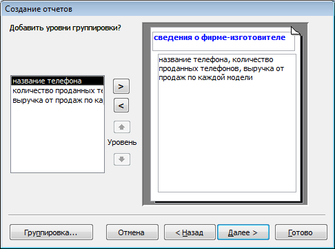 Выделим на левой панели окна поле Сведения о фирме-производителе для задания уровни группировки, щелкнем по кнопке с одной стрелочкой, затем Далее.
