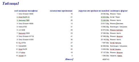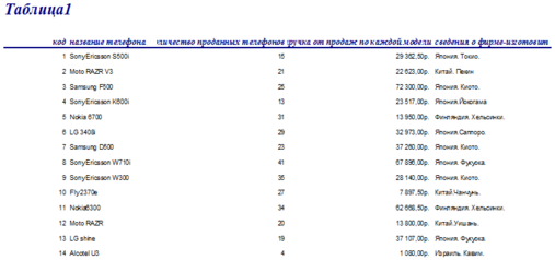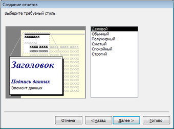 Выберем стиль отчета (деловой), щелкнем Далее, зададим имя отчета Название телефонов и щелкнем по кнопке Готово.