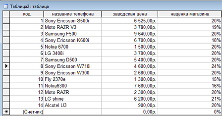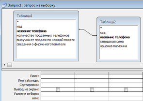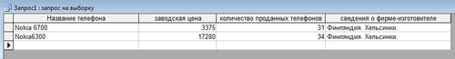 Щелкнуть по первой пустой ячейке строки Поле, нажать по значку раскрывающегося списка, а затем щелкнуть по имени Название телефона; аналогично формируется поле Заводская цена, Количество проданных телефонов и Сведения о фирме-изготовителе.