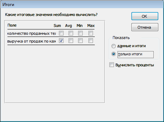 4) Щелкнем по кнопке Итоги, установим флажки параметрам Sum для полей выручка от продаж по каждой модели, щелкнем по кнопке Ок, выберем поле Название телефона для задания сортировки по возрастанию, затем щелкнем по кнопке Далее.