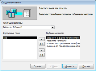 Переместим все поля таблицы с панели Доступные поля на панель Выбранные поля, выполним щелчок на кнопке с двумя стрелочками, затем по кнопке Далее.