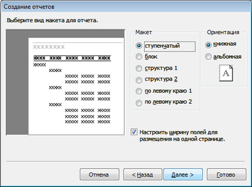 Выберем макет отчета (ступенчатый), ориентацию (книжную) и щелкнем Далее.