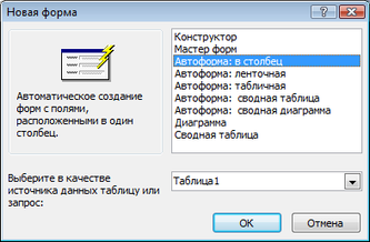Для создания автоформы в столбец нужно выполнить те же действия, только при появлении окна «Новая форма» нужно выбрать Автоформа: столбец.