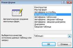 В окне Новая форма выделите Автоформа: ленточная, выберите в качестве источника данных Таблицу1 и щелкнуть по кнопке Ок.