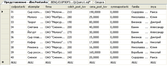 create view Postavka as select Postavka_tovara.codpostavki, Tovar.ekzemplar, Postavsiki.firma,Postavka_tovara.colich_post_tov, Postavka_tovara.cena_post_tov, Postavka_tovara.symmapostavki, Manageri_postavok.familia, Manageri_postavok.imya from Postavka_tovara inner join Postavsiki on Postavka_tovara.codpostavsika = Postavsiki.codpostavsika inner join Tovar on Postavka_tovara.codtovara = Tovar.codtovara inner join Manageri_postavok on Manageri_postavok.cod_meng_postav = Postavka_tovara.cod_meng_postav