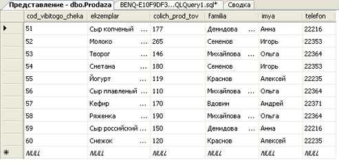 create view Prodaza as select Prodaza_tovara.cod_vibitogo_cheka, Tovar.ekzemplar, Prodaza_tovara.colich_prod_tov, Prodavci.familia, Prodavci.imya, Prodavci.telefon from Prodaza_tovara inner join Tovar on Prodaza_tovara.codtovara = Tovar.codtovara inner join Prodavci on Prodaza_tovara.codprodavca = Prodavci.codprodavca